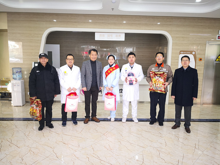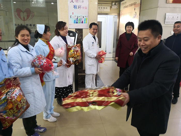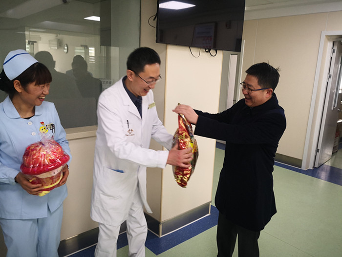 委领导走进科室,亲切看望慰问一线值班人员,为他们送上关怀和新春的祝福,并与值班人员亲切握手详细了解节日期间医院门诊量、医疗秩序、医疗安全等工作情况,委领导对他们新春佳节坚守工作岗位的奉献精神表示感谢和敬佩,祝辛勤工作在一线的医务人员和家属新春愉快,猪年吉祥,送上了精心准备的慰问品并合影留念。委领导对节日期间医院各项工作给予了肯定,并对加强医疗安全、提升服务水平等工作提出建议及要求,确保医院节日期间各项工作安全平稳运行。