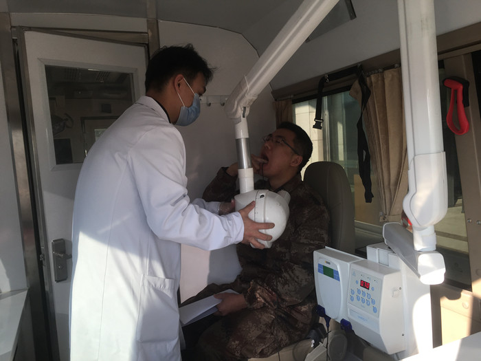 此次活动由市口腔医院口腔修复专业主任医师刘晓华副院长、牙体牙髓病和牙周病专业主任医师杜毅副院长带队,共计12名医师参加。三个多小时的时间,为200多名官兵和军属进行了口腔检查的同时进行了口腔卫生宣教,详细讲解了刷牙、牙线和牙间隙刷的使用等龋病和牙周病的预防知识,赠送了牙线和牙间隙刷等200余套。另外,利用移动诊疗车为30多名官兵进行了影像检查,排查出多例邻面早期龋坏和埋伏阻生牙,同时指导急需治疗的官兵制定了治疗方案并通过微信公众号预约了治疗时间。