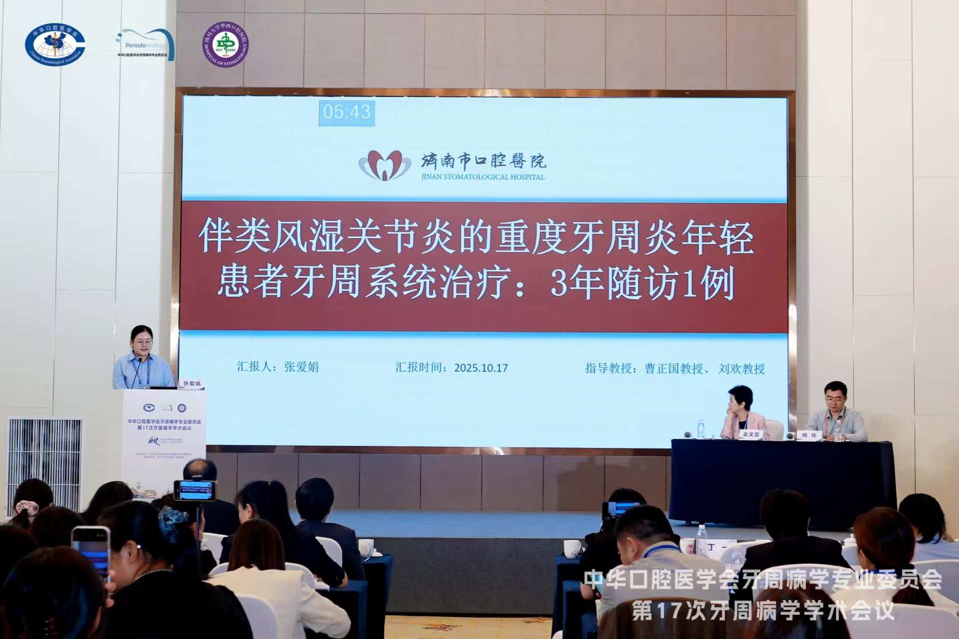 两位医生的汇报基于详实临床数据与规范随访研究,充分展现我院在牙周专业领域的扎实积累与前沿探索,引发与会者热烈讨论。另有中心实验室于西佼主任《牙周炎症延迟大鼠拔牙创骨愈合》、舜耕院区孙晓东主任《冠向复位瓣(CAF)+上皮下结缔组织(SCTG)移植改善左下后牙区正畸、种植治疗后牙龈生物型一例》、历城院区住院医师孙龙《上前牙冠延长术+全瓷冠美学修复一例》三项成果进行壁报展示。