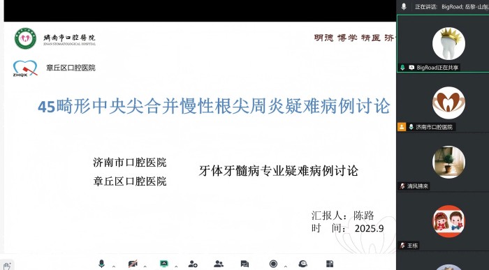 为深化对口支援建设成效,整合优质医疗资源,提升受援单位疑难病例诊疗能力,2025年9月18日,济南市口腔医院与章丘区口腔医院联合举办线上疑难病例讨论会。会议积极邀请济南市口腔医院口腔医学专科联盟成员单位、省会经济圈1+6口腔医学发展联盟成员单位相关专业医生线上参会,针对牙体牙髓病专业疑难病例展开专家讨论,提升区域内复杂根尖周病的诊治水平。