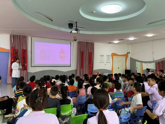 9月19日下午,舜耕院区医务人员文瑞雪、袁鹏来到银座英才幼儿园,为100余名孩子送去了健牙护齿讲座并现场解答相关口腔健康问题。文医生通过生动的PPT给孩子讲述爱牙日的来历、牙齿的结构、常见牙齿疾病及爱牙护牙相关知识,并借助牙齿模型,通过生动有趣的讲解,指导孩子们正确刷牙,培养从小爱牙护齿的口腔保健意识。
