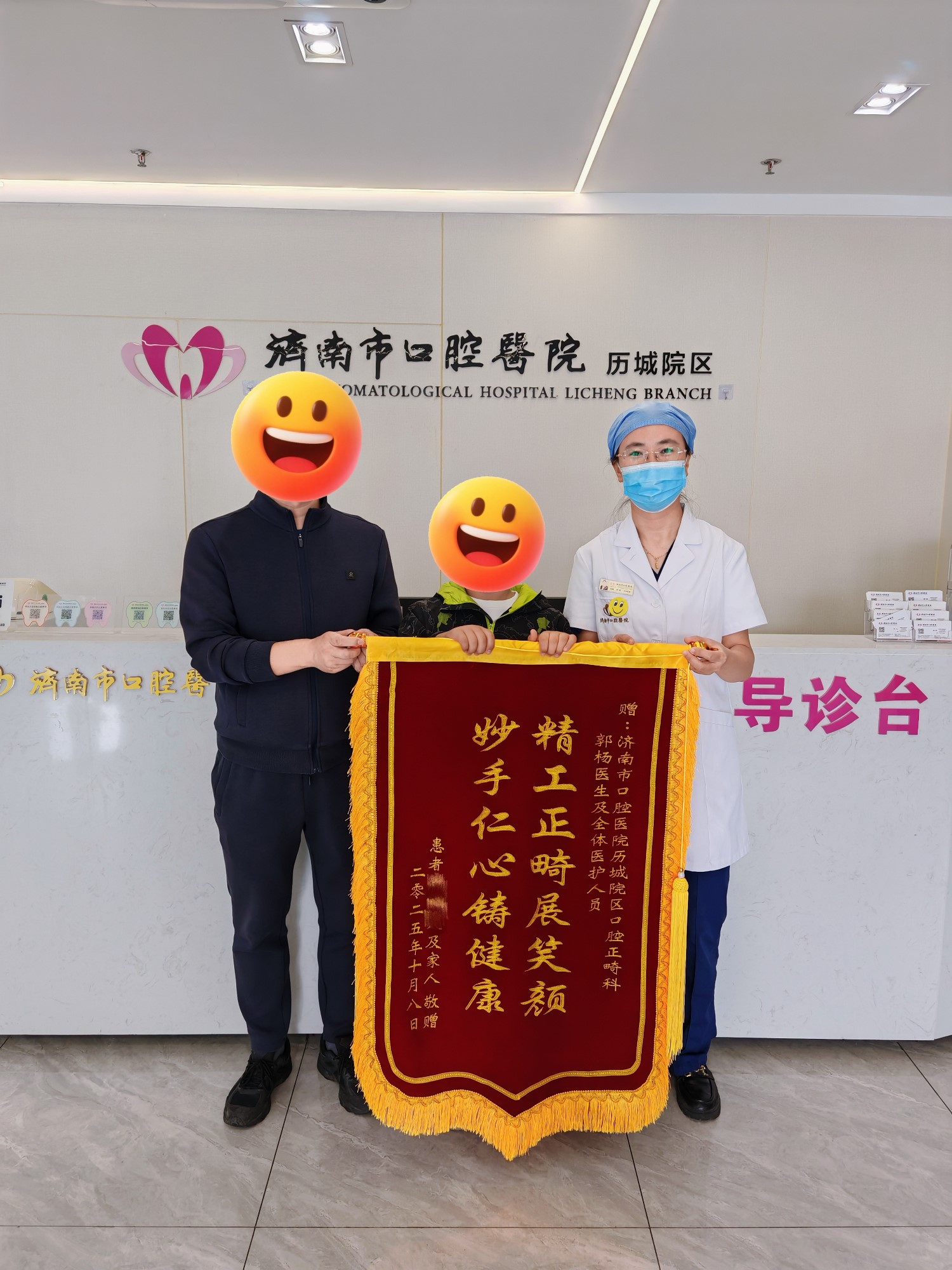 10月7日,国庆长假的最后一天,历城院区的候诊门诊大厅依旧人来人往。上午10点,一位手捧锦旗的家长快步走向正畸科,将绣有“妙手仁心铸健康 精工正畸展笑颜”的锦旗郑重交到院区正畸科郭杨主治医师的手中。“没想到孩子‘失踪’一年多的门牙,能在两个月内重新‘上线’,我们全家都很高兴!”家长激动地说。