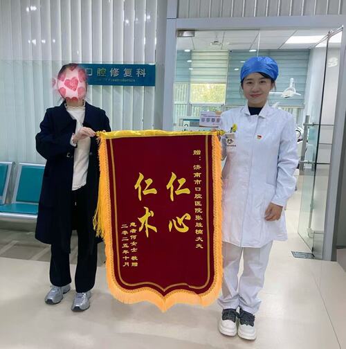 近日,来自日照的何女士专程乘坐火车再次来到济南市口腔医院东院区复诊,并将一面印着“仁心仁术”的锦旗,郑重地交到张胜楠主任手中,用最真挚的方式表达感激之情。
